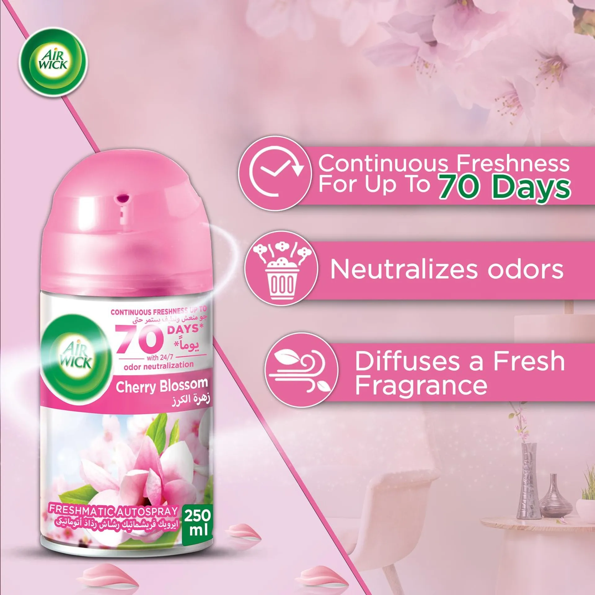 Air Wick Freshmatic Automatic Sprays, now with 5x odour neutralisation power, are designed for 24/7 odour neutralisation for up to 70 days on lowest setting. Air Wick’s Freshmatic has a variety of fragrances to use around your home. Tackle 5 of the toughest and most common home odours with this Cherry Blossom scent.