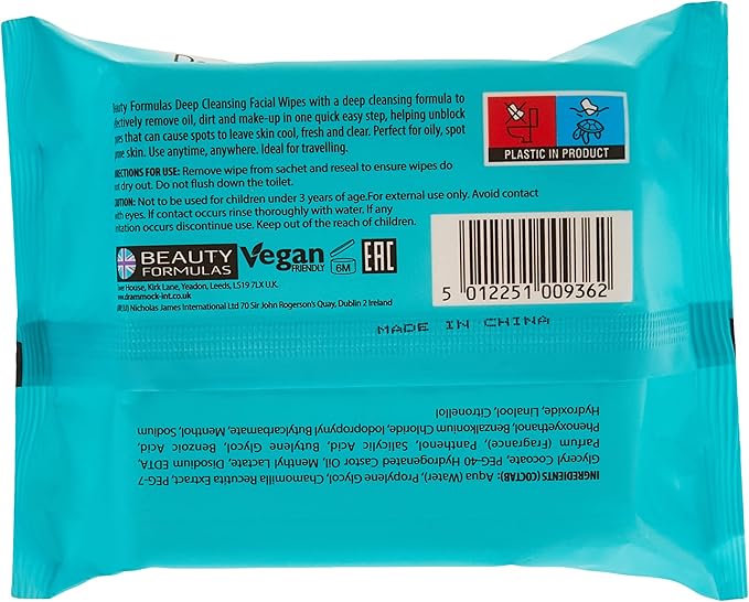 Beauty Formulas Deep Cleansing Facial Wipes for Spot-Prone Skin – 30 Wipes