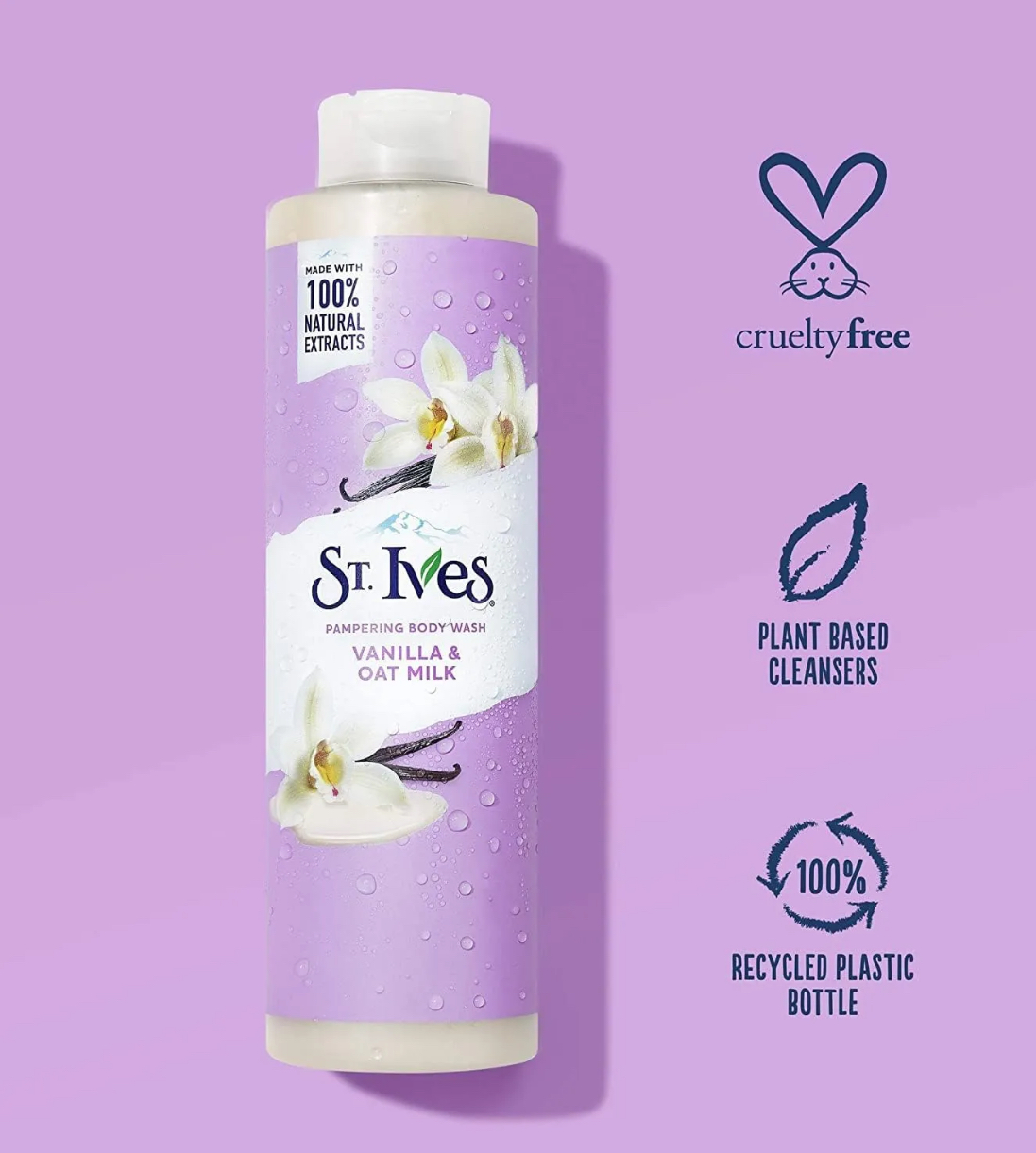 Made with 100% natural vanilla and oat milk extracts, St. Ives Vanilla & Oat Milk Pampering Body Wash gives your skin an indulgent, creamy, and luxurious cleanse. Breathe in the creamy aroma of vanilla, and we bet you will feel instantly pampered! Upgrade your shower experience with this body wash that leaves your skin feeling soft and smooth. Formulated with plant-based cleansers, this body wash pampers the skin, leaving it soft, supple, and hydrated. When you are ready to relax, smell the blanketed aroma of creamy vanilla and detectable oat milk. How to use: pour a generous amount of this body wash onto your hands or favourite squishy pouf! Lather over wet skin, soaking up the incredible scent. When you are done, rinse off. For best results, use daily with our luxurious and moisturizing body lotions to achieve the soft, healthy look that your skin deserves. At St. Ives, we are superfans of everything nature. Enriched with 100% naturally sourced extracts, our body washes take gentle care of your skin, which makes them suitable for daily use. St. Ives skincare products are dermatologist tested and paraben-free. St. Ives does not test on animals anywhere in the world and is certified Cruelty-Free by PETA.