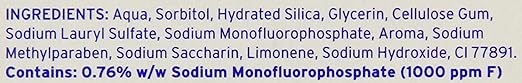 Aqua, sorbitol, hydrated silica, glycerin, cellulose gum, sodium lauryl sulfate, sodium monofluorophosphate, aroma, sodium methylparaben, sodium saccharin, limonene, sodium hydroxide, ci 77891, contains: 0.76 percent w/w sodium monofluorophosphate (1000 ppm F).